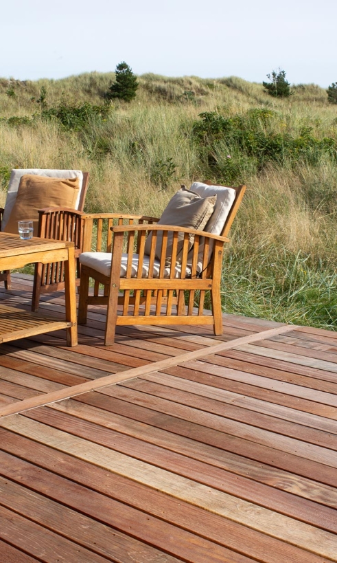 Jatoba, også kendt som brasiliansk kirsebærtræ, er en hård og slidstærk træsort med en rødbrun glød, der tilfører terrassen en eksklusiv og samtidig naturlig karakter. Med sin tætte struktur og høje slidstyrke er Jatoba velegnet til det danske klima. Som her, hvor sommerhuset ligger blot få skridt fra hav og sand.