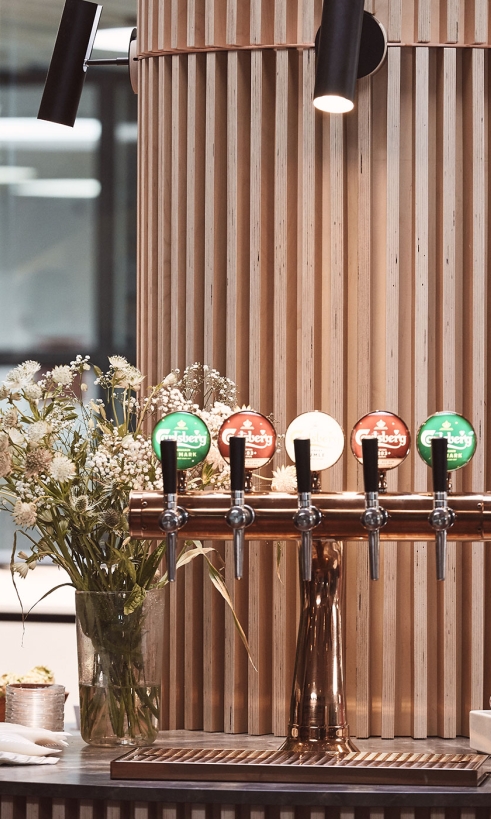 De unikke snedkerudskæringer i den lyse birkekrydsfiner skaber rene og indbydende rammer for de mange hundrede gæster, der slår deres vej forbi loungen hver eneste dag.