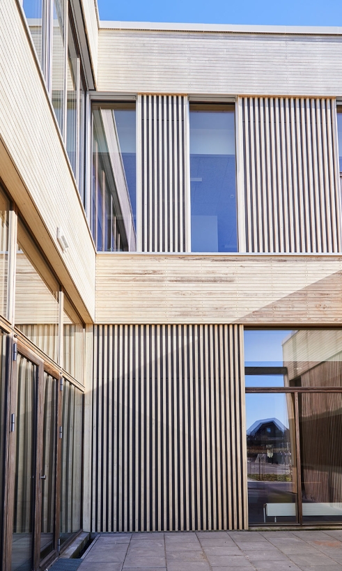 Alt dette, sammen med en garanti for træets varighed, gør Accoya til en af de mest veldokumenterede trætyper til byggeriet. Accoya var derfor et oplagt valg til et træbyggeri, der skal danne rammerne for indlæringen hos de næste mange generationer i Erlev.