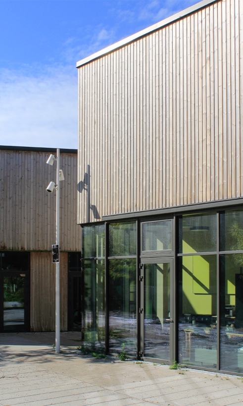 Facaden i træ står som en varm og indbydende kontrast til de grå modernistiske boligblokke på fire og otte etager. Materialevalget tilfører bygningen en varme og naturlighed, der bløder bybilledet op og gør området imødekommende. Træet er termobehandlet fyrretræ fra Keflico, et robust og holdbart materiale, der er særligt velegnet til det nordiske klima. Med tiden vil træet patinere i smukke sølvgrå nuancer, som allerede kan anes på facaden.