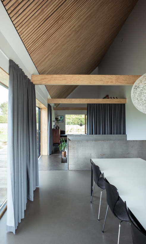 Indendørs er der også blevet gjort brug af træ i form af krydsfinersplader – både hele og opskåret til lister. Pladerne og udnyttelsen af deres unikke strukturer er et gennemgående element i hele boligen og er blevet brugt til alt fra trapper til loftsbeklædning.