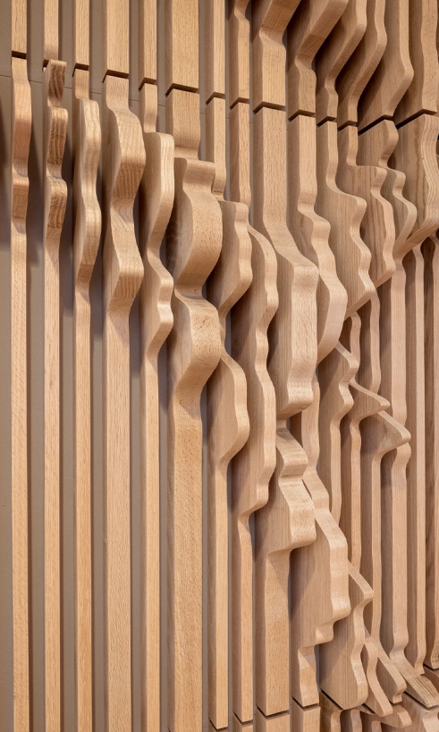 Med projektet har jeg forsøgt at nytænke de akustiske lamelvægge, som er et gennemgående visuelt og funktionelt element i bygningens arkitektur. Ved at CNC-fræse massive planker af rødeg, har det været muligt at omdanne og forfine de akustiske lamelvægge til store tredimensionelle relieffer med motiver af grene.