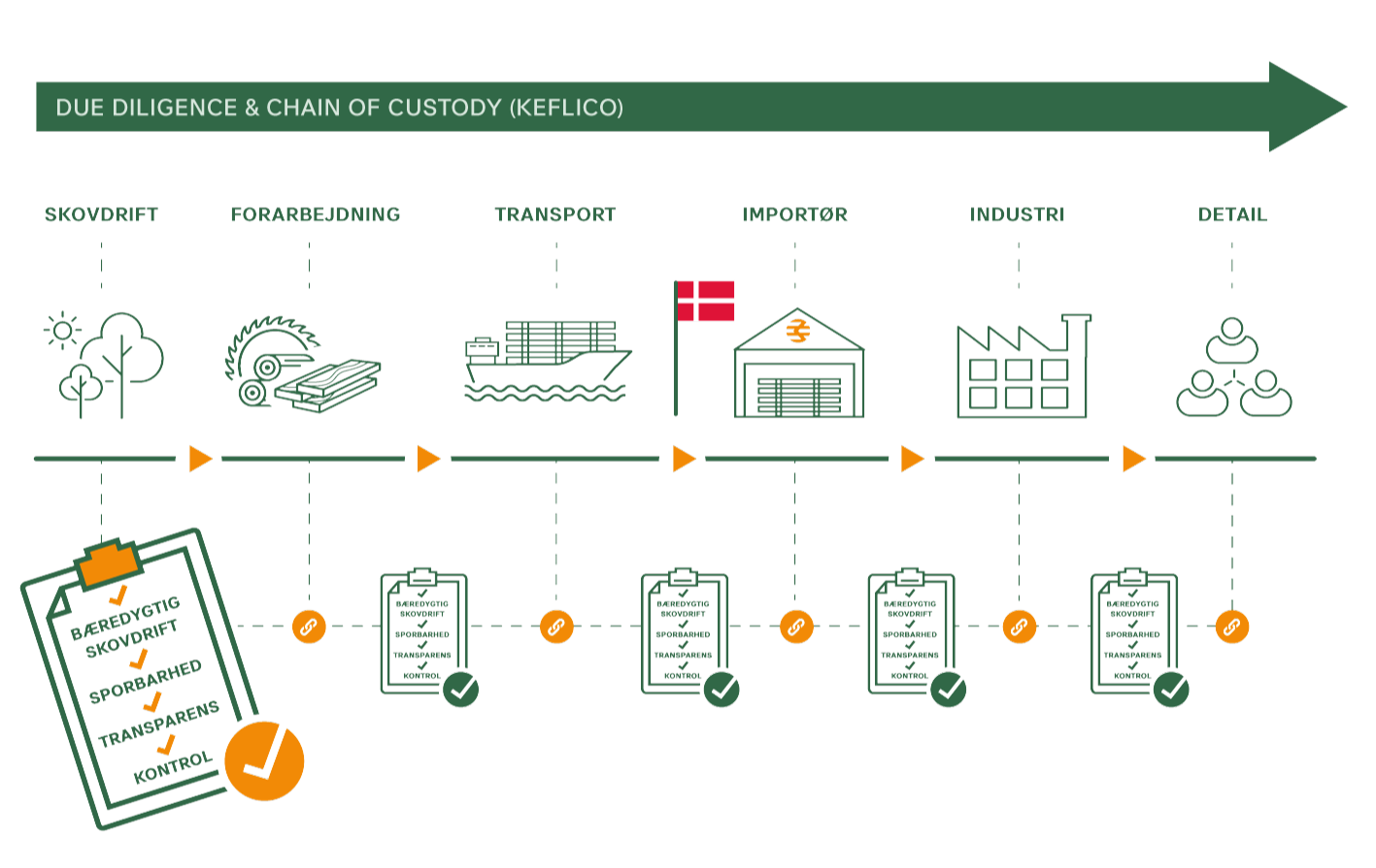 I praksis håndterer vi dette ved brug af robuste sporbarhedskæder, chain of custody, til dokumentation af træets rejse ned gennem handelskæden. Hermed dokumenteres det, hvem der har håndteret træet hvornår og hvordan, så det risikominimeres at træet ikke er blevet ombyttet eller forvekslet med lignende leverancer. Dertil kommer vores Due Diligence proces, som fuldstændiggør dokumentationssystemet baseret på sporbarheden og aktørerne i kæden.